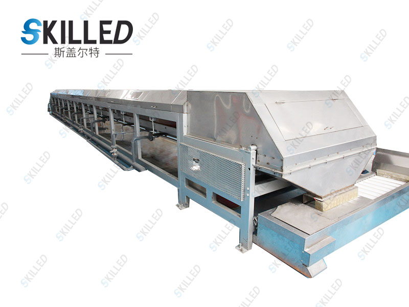 聚酰胺树脂造粒机是利用物料的熔点低于300℃的特性,根据物料熔融态时的粘度范围,通过特殊的布料装置将熔融液均匀在其下方匀速移动的钢带上,在钢带下方设置的连续喷淋装置的冷却作用下,使物料在输送、移运过程中得到冷却、固化、包装,从而达到造粒成型的目的。