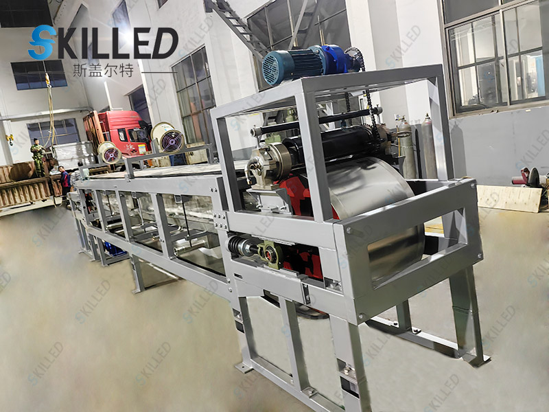 该机主要由落料模造粒成型机头,冷却输送不锈钢带及带轮、喷淋冷却系统、传动系统、保温装置、机架、刮刀等组成。落料模造粒机头主要由机头模套和机头芯轴等组成。喷淋冷却系统主要由喷头、盛水池等组成。传动系统主要由减速箱(减速器)调速电机等组成。