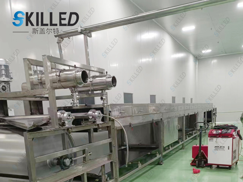 产品概述 巧克力造粒机是利用物料的熔点低于250℃的特性,根据物料熔融态时的粘度范围,通过特殊的布料装置将熔融液均匀在其下方匀速移动的钢带上,在钢带下方设置的连续喷淋装置的冷却作用下,使物料在输送、移运过程中得到冷却、固化、包装,从而达到造粒成型的目的。